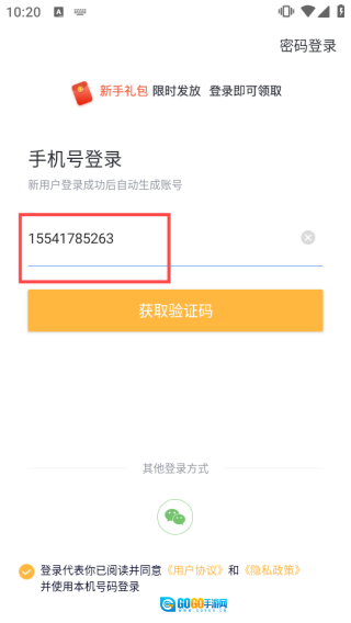 2、在手机号登录界面,输入手机号码,点击【获取验证码】。