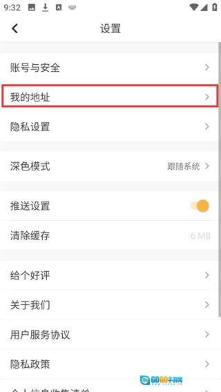 3、在【设置】界面中,找到并点击【我的地址】选项,可进入地址管理页面。