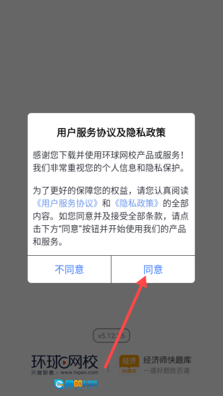 1、打开环球网校,阅读【用户服务协议及隐私政策】后,点击【同意】按钮。