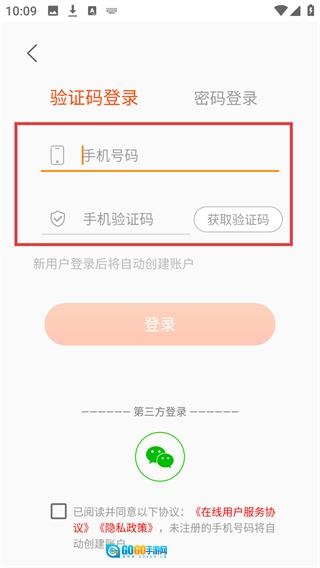 3、进入登录界面后,选择【验证码登录】的方式,要填写【手机号码】并获取【手机验证码】。