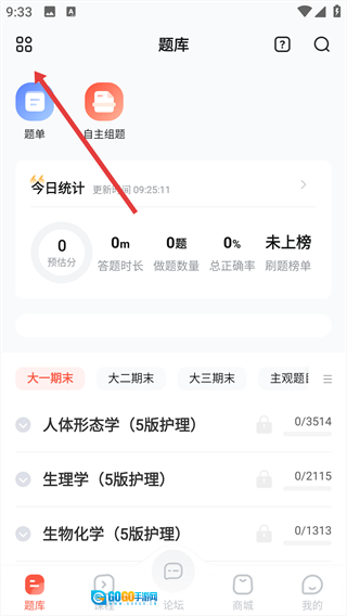 1、进入题库页面后,点击左上角的功能图标,即可进入考试类型选择界面。