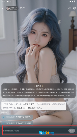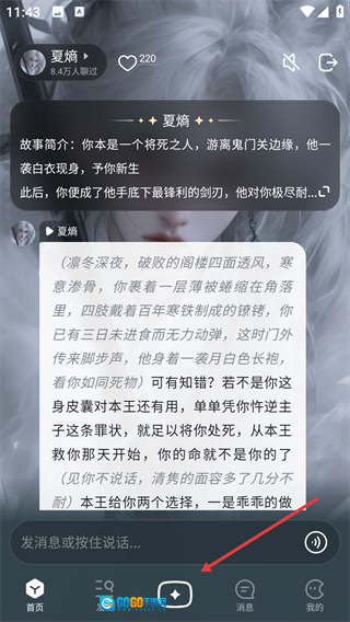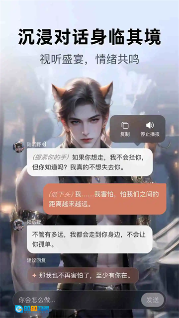3、在角色对话页面,可选择系统提供的建议回复,或者登录后自行编辑自定义内容,之后点击【发送】按钮完成互动。