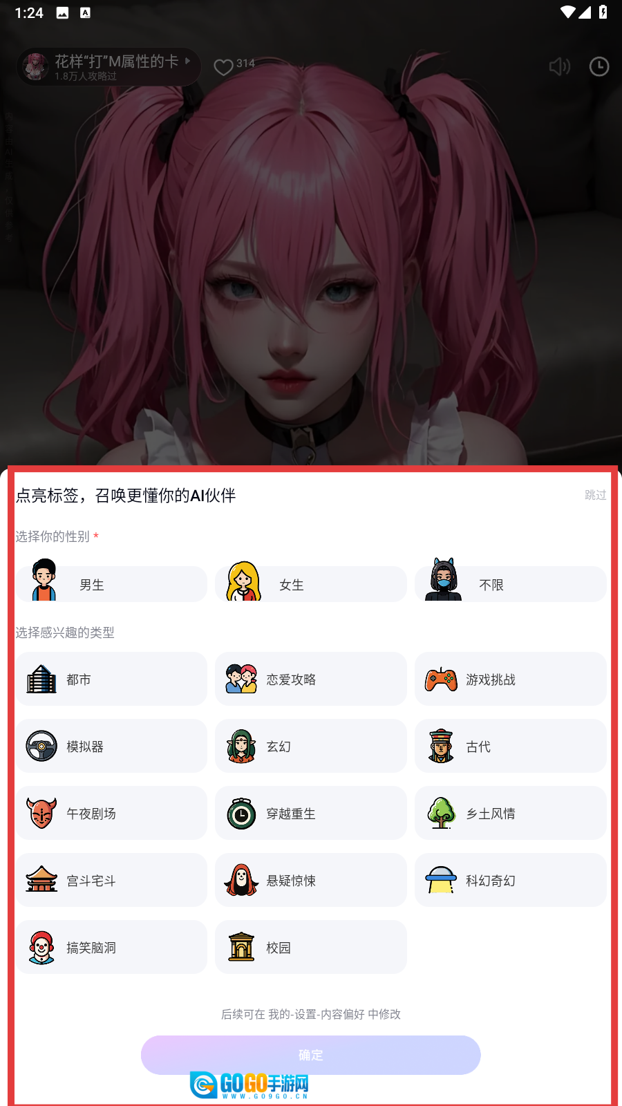 1、在初始页面选择性别(男生/女生/不限)与兴趣类型,点击【确定】按钮即可点亮对应标签。