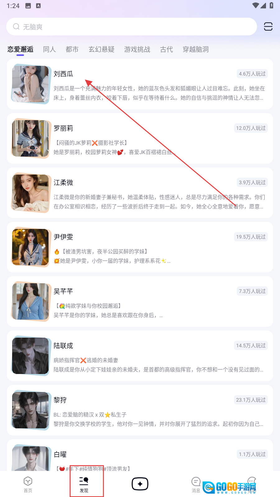 2、切换至【发现】页面,浏览角色列表,点击感兴趣的角色进入。