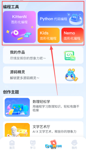 2、进入学习界面后,孩子可以选择不同的课程主题,课程内容涵盖从图形化编程到Python语言,让孩子在任务驱动下轻松学习。