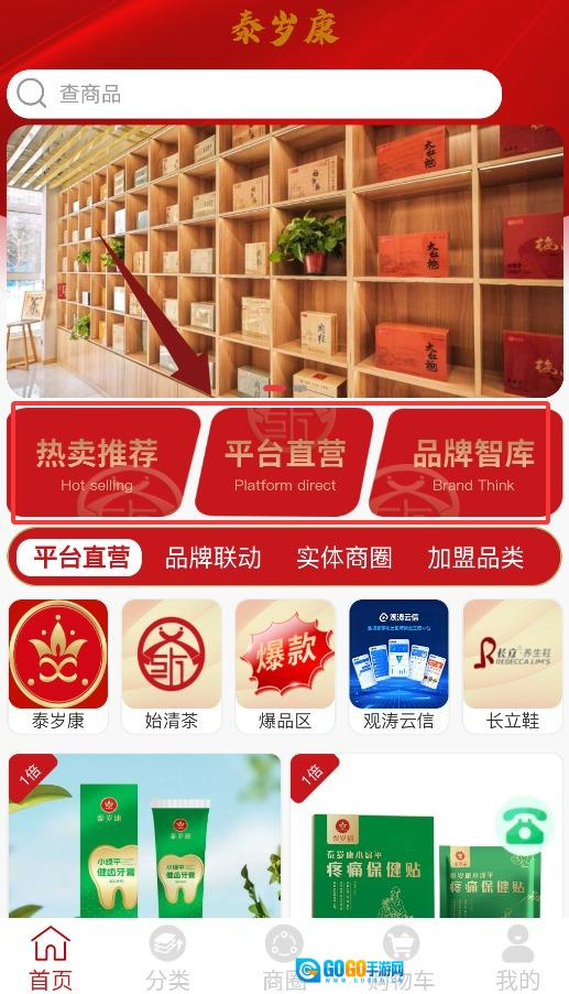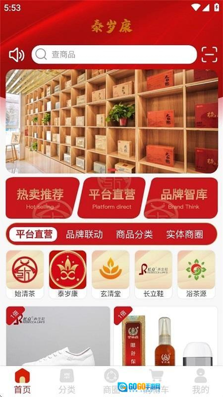 2、首页展示热卖推荐、平台直营商品及品牌智库等内容。