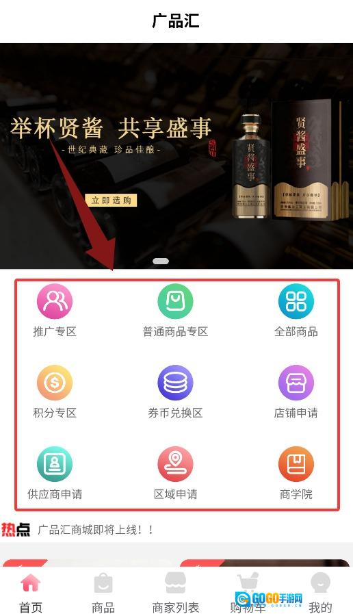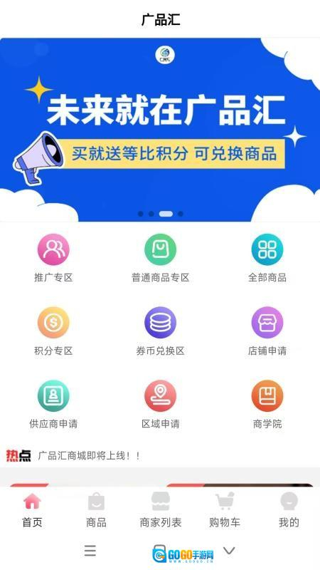 2、首页设有推广专区、普通商品、积分兑换与店铺申请等入口。