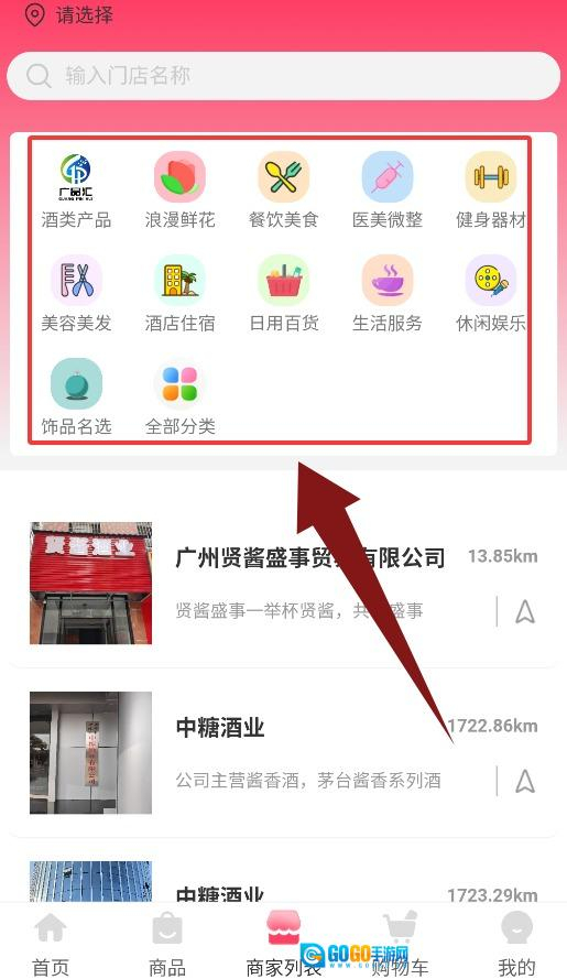 4、商家列表支持查看酒类、鲜花、餐饮美食及医美等类别。