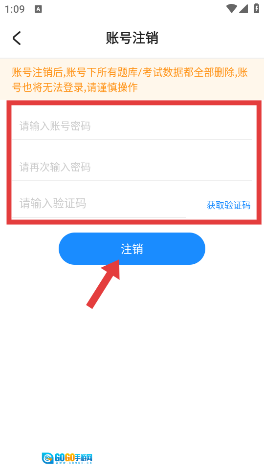4、在方框内输入密码、再次输入密码、获取并输入验证码后,点击【注销】完成操作。