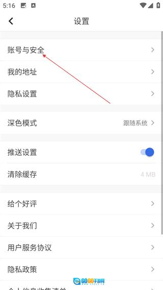 3、进入设置页面后,点击【账号与安全】选项,即可进入账号管理页面。