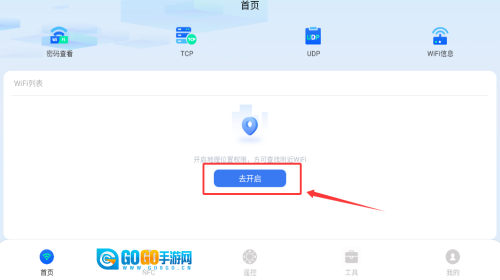 2、在首页点击蓝色去开启按钮查询网络。