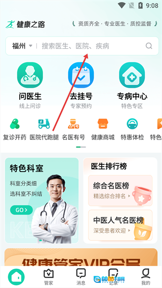 1、在【健康之路】首页,点击顶部的搜索栏。