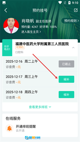 4、查看医生的出诊时间,选择可候补的时段,进行挂号候补操作。