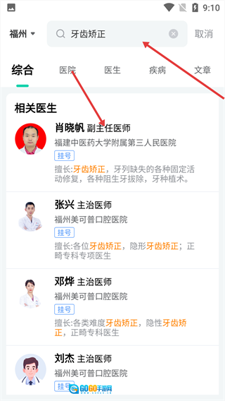 2、在搜索栏输入【牙齿矫正】,进入搜索结果页,选择目标医生。