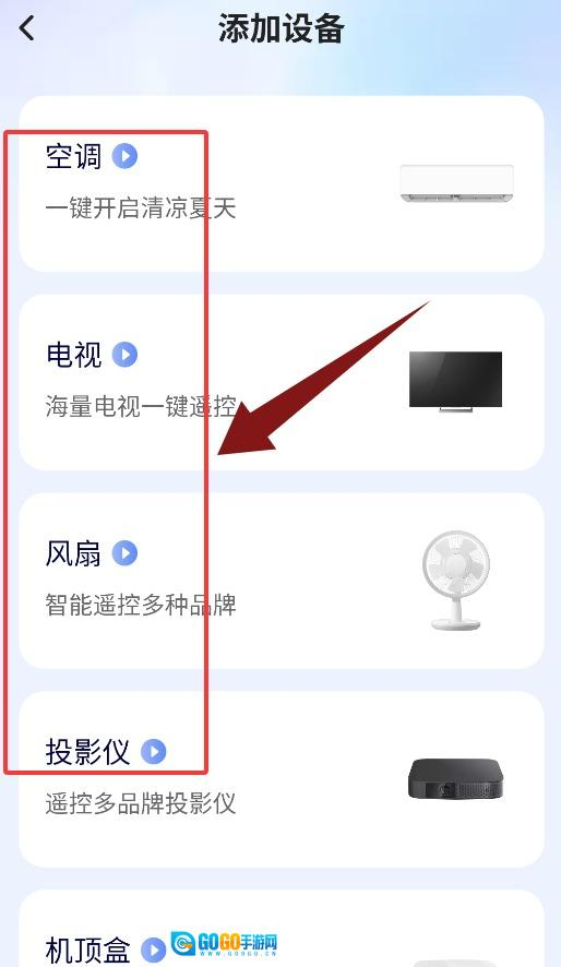 3、进入添加设备界面后,请挑选您想要通过遥控进行控制的相应设备类型。
