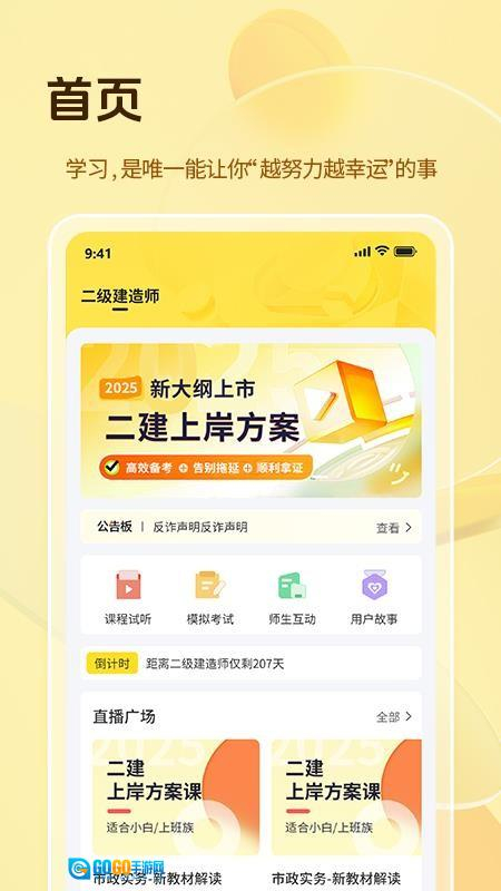 鲁建教育为二级建造师考生提供专业备考方案,整合名师课程与海量题库资源。支持课程试听功能,方便选择适合的学习内容。直播课堂实现实时互动答疑,提升学习效果。模拟考试系统还原真实考场环境,检验知识掌握程度。