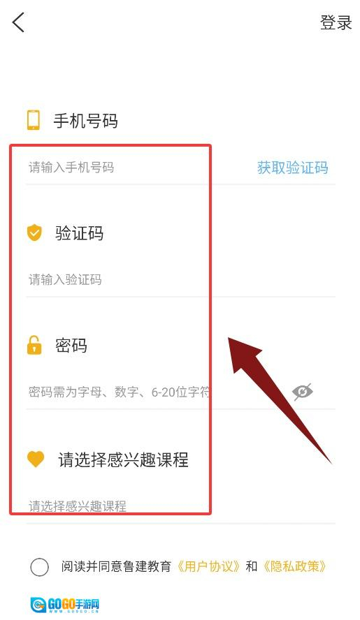3、注册时输入手机号、验证码、密码并选择兴趣课程即可完成。
