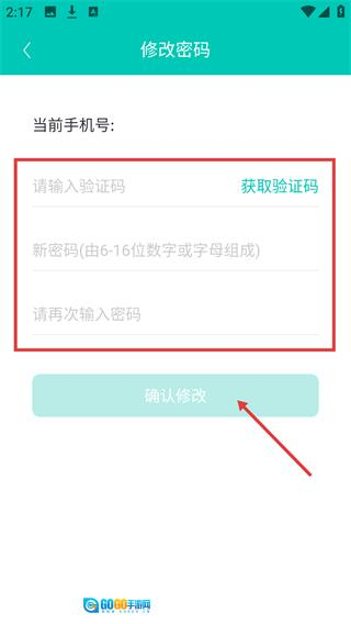 4、进入【修改密码】页面,先点击【获取验证码】,填写验证码与新密码后,点击【确认修改】完成密码修改操作。