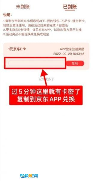 3、等待5分钟后复制兑换码,然后进入京东APP,依次点击“我的”-“我的钱包”-“礼品卡”,在对应位置粘贴兑换码完成兑换操作。