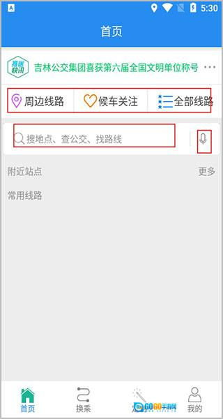 1、随后打开进入首页,在这个页面能够搜索地点,查询公交以及周边路线;