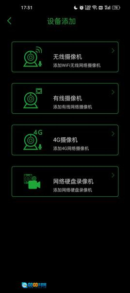 3、之后选择你需要添加的设备,根据你摄像头的类型进行添加,这里有无线摄像机、有线摄像机、4g摄像机、网络硬盘录像机这四种类型的设备;