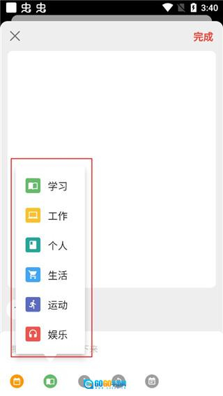 4、在此处能够挑选自己规划的类型,涵盖:学习、工作、个人、生活、运动、娱乐。