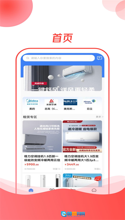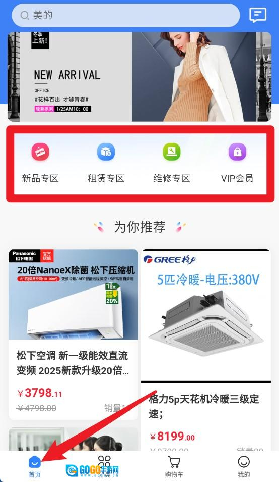1、点击首页按钮可查看推荐商品、新品专区、租赁维修及会员等快捷入口模块。