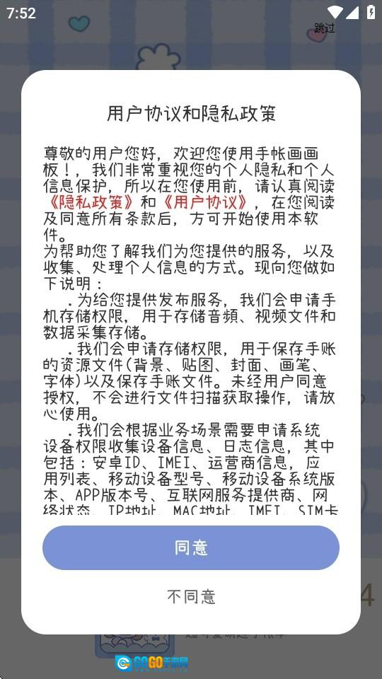 1、打开手帐画画板,仔细阅读用户协议和隐私政策后,点击“同意”按钮进入。