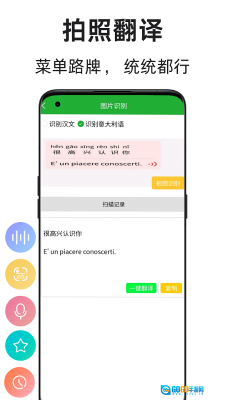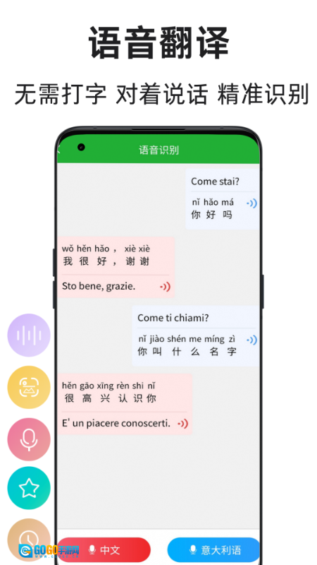 1、专注意大利语与中文互译,支持输入语音拍照等多种翻译形式,适配不同场景下的翻译操作需求。