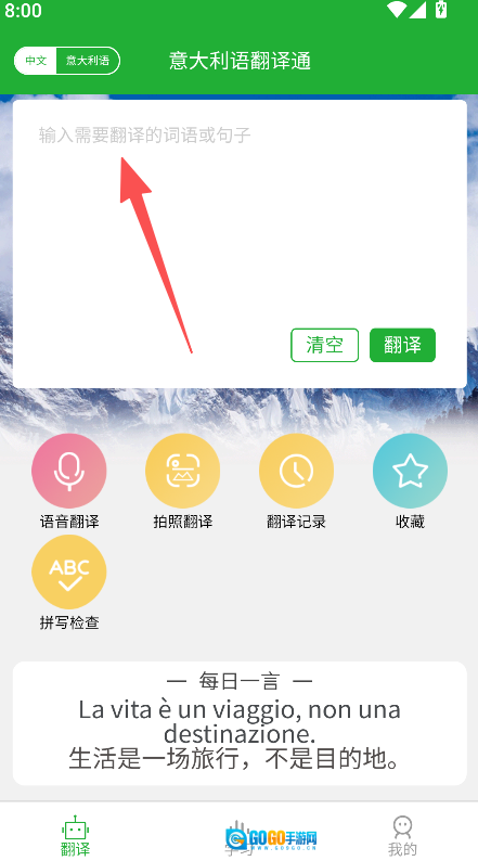 《意大利语翻译通》是一款意大利语翻译类软件,支持输入词语或句子进行翻译,含语音翻译拍照翻译功能,配备翻译记录收藏拼写检查工具,设每日一言板块展示双语内容,可切换语言方向,完成翻译操作后获取对应译文,助力意大利语与中文间的互译,满足不同场景下的翻译需求,提供辅助工具及内容板块,丰富翻译相关的使用体验。