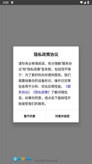 1、安装App后,在初始弹窗中点击同意用户协议。