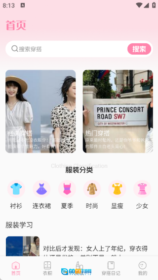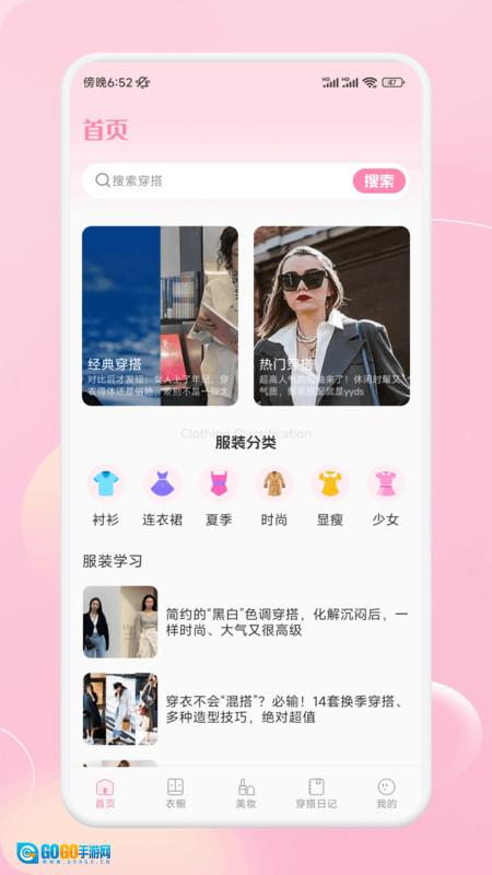 1、首页设有经典穿搭、热门穿搭板块,同时也展示各类服装分类信息,方便用户快速了解相关内容。