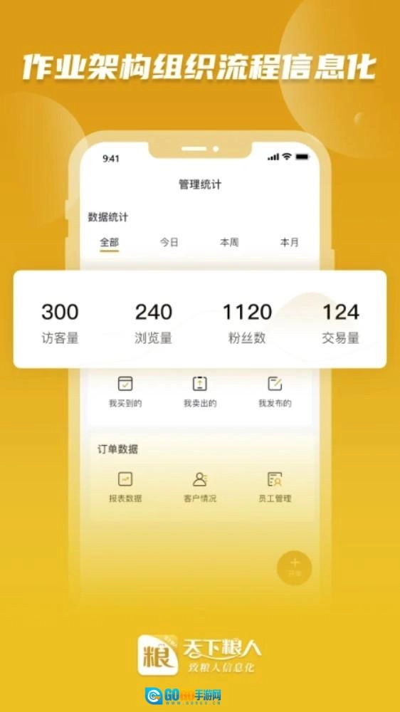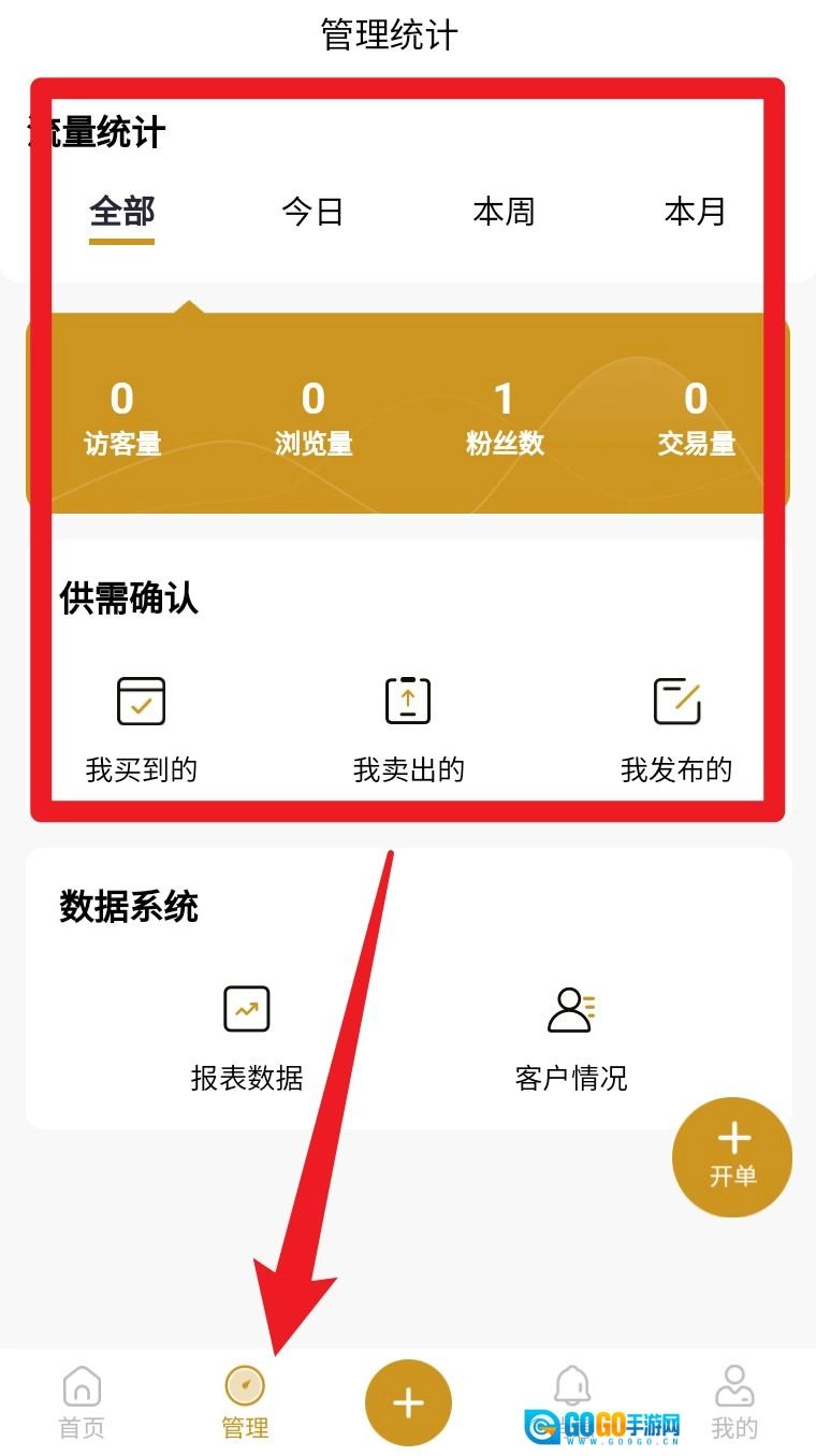 4. 点击底部管理进入数据中心,访问流量统计与订单管理功能进行供需确认。