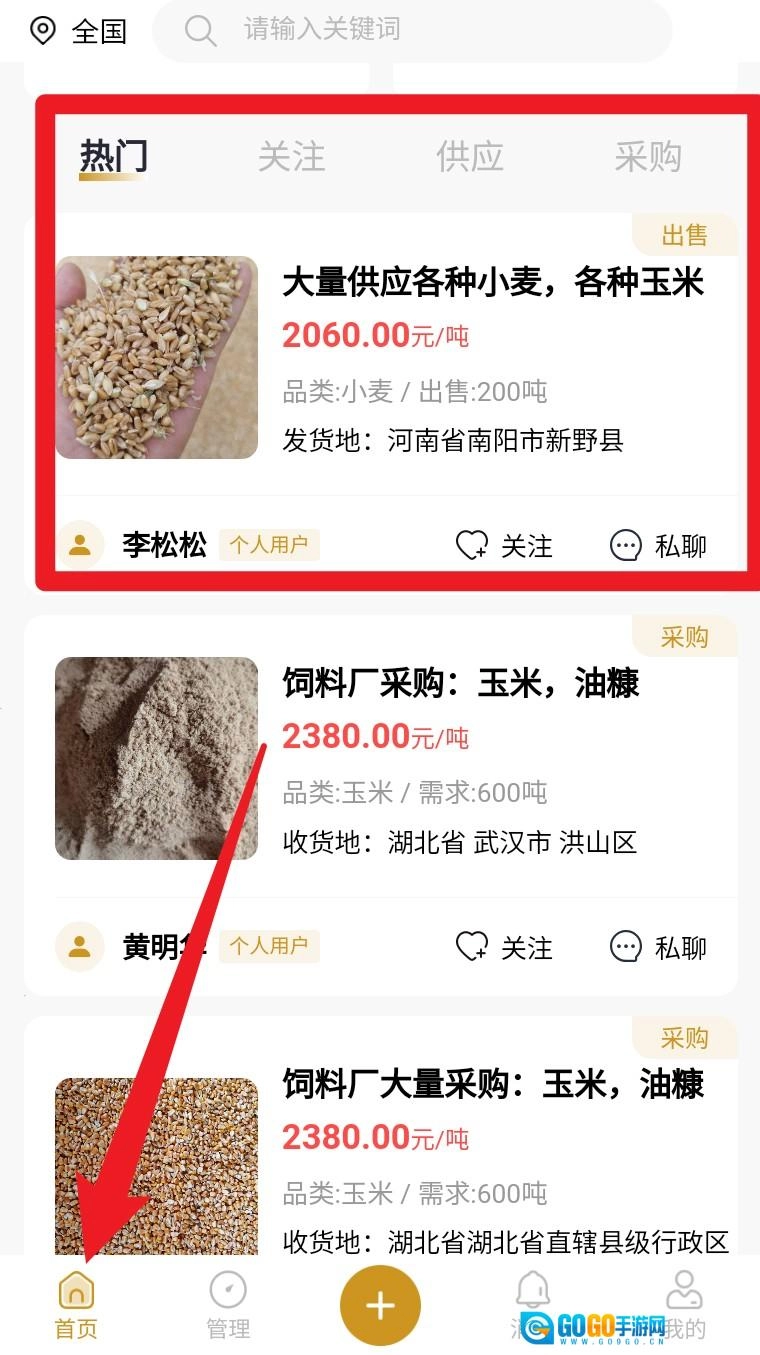 3. 切换到首页页面可查看供应、采购商品内容,支持私聊卖家、关注收藏。