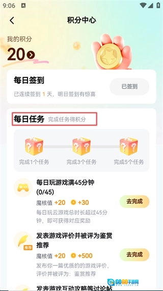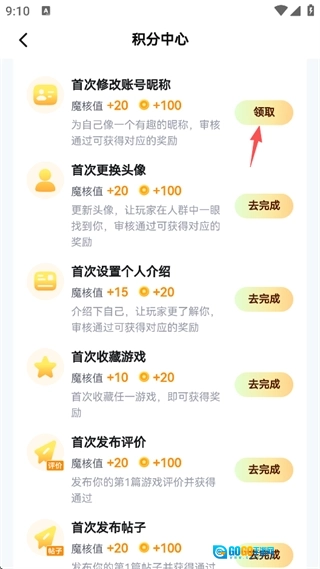 6、在返回任务,点击对应任务的“领取”即可获得魔核值和积分。
