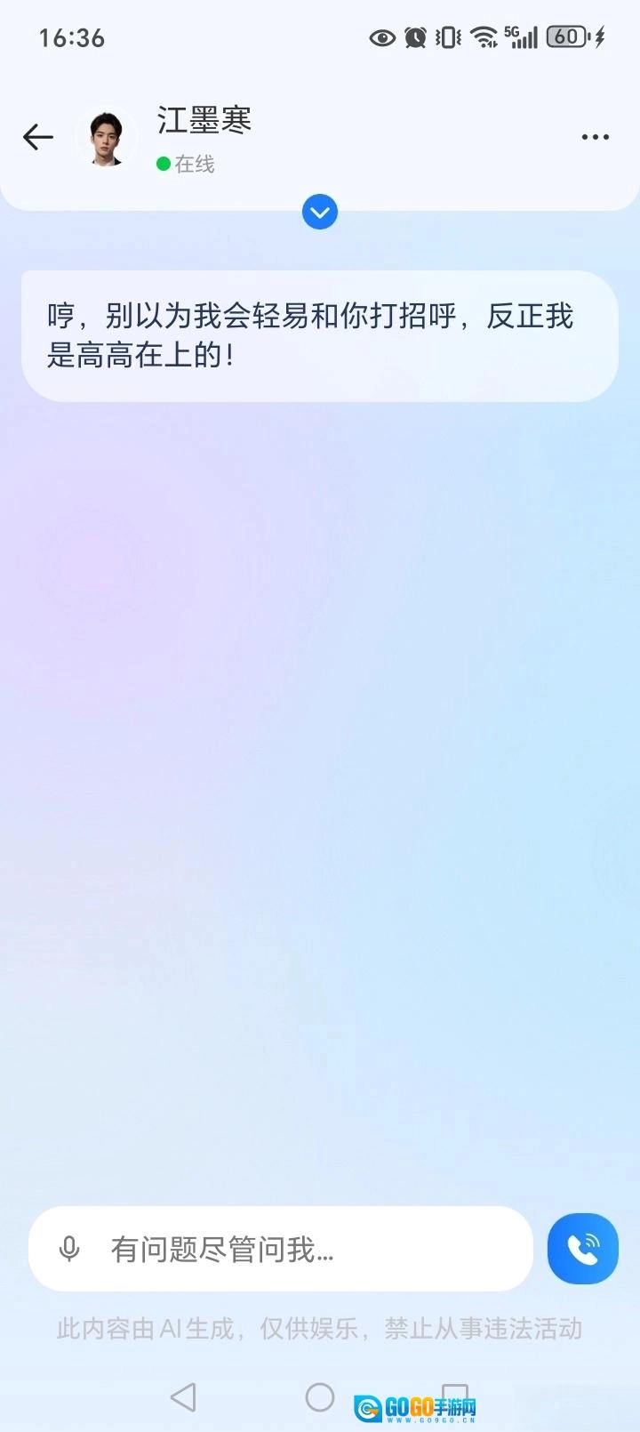 《AI语音通话》是合肥莫寒科技有限公司开发的智能软件,具备AI文字及语音聊天功能。软件若干AI角色供用户互动,同时支持自定义创建——只需上传照片、设置昵称并描述性格,就能一键生成专属AI角色,进而与其展开聊天互动。