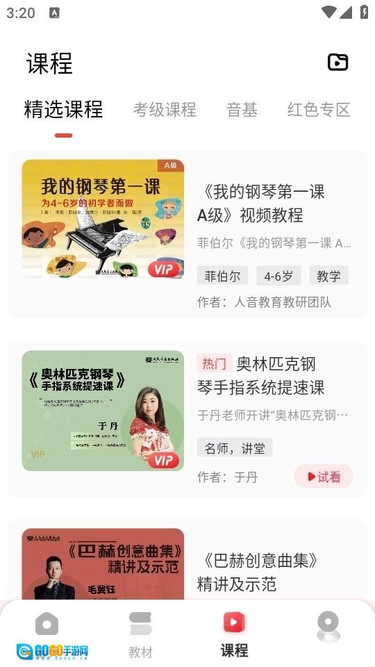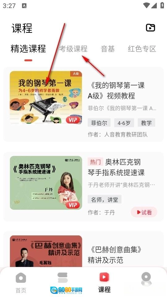 点击下方的课程,就能跟随软件内的视频学习钢琴;如果是考级用户,也能在课程界面找到对应的考级课程。