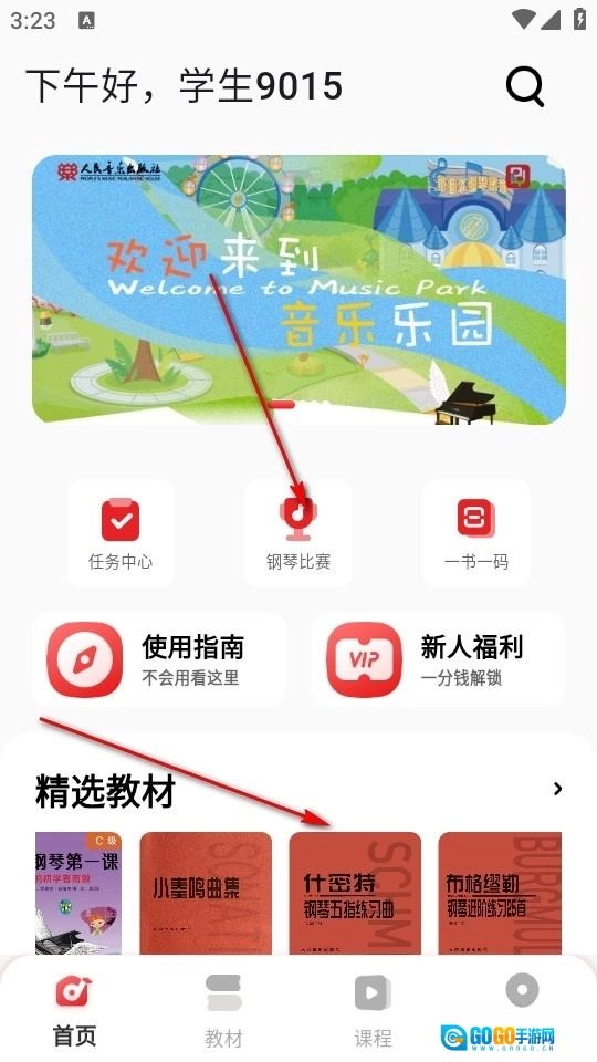 在首页,我们可以看到钢琴比赛的相关资讯、宣传页面,还有平台精心挑选的学琴教材。