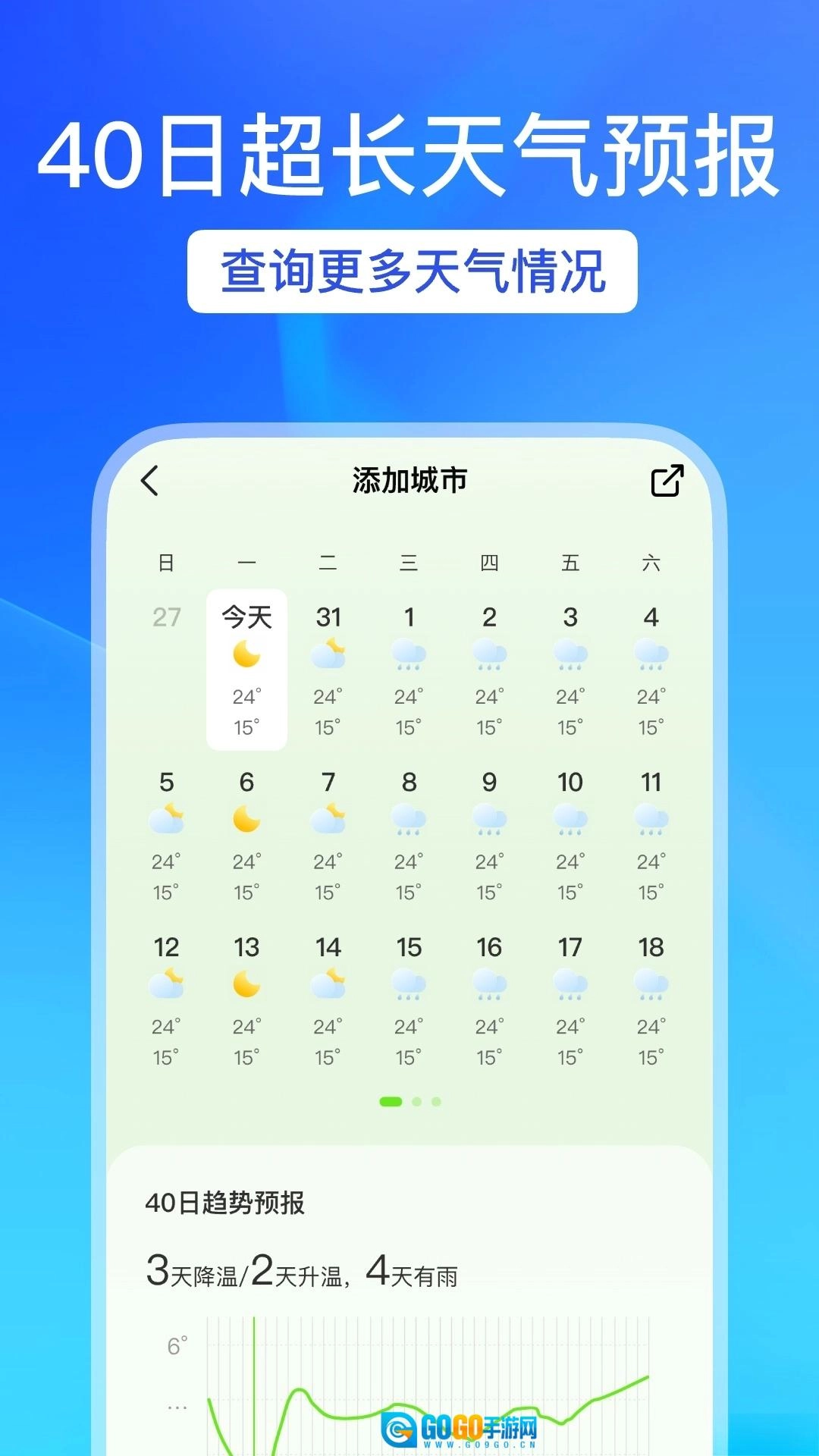 超长周期精准预报服务:具备40日天气趋势预测能力,融合权威气象机构的数据资源与先进AI算法,为用户呈现逐日的温度变化、降水概率及天气动态提示,助力用户提前做好准备以应对长期的天气波动情况。