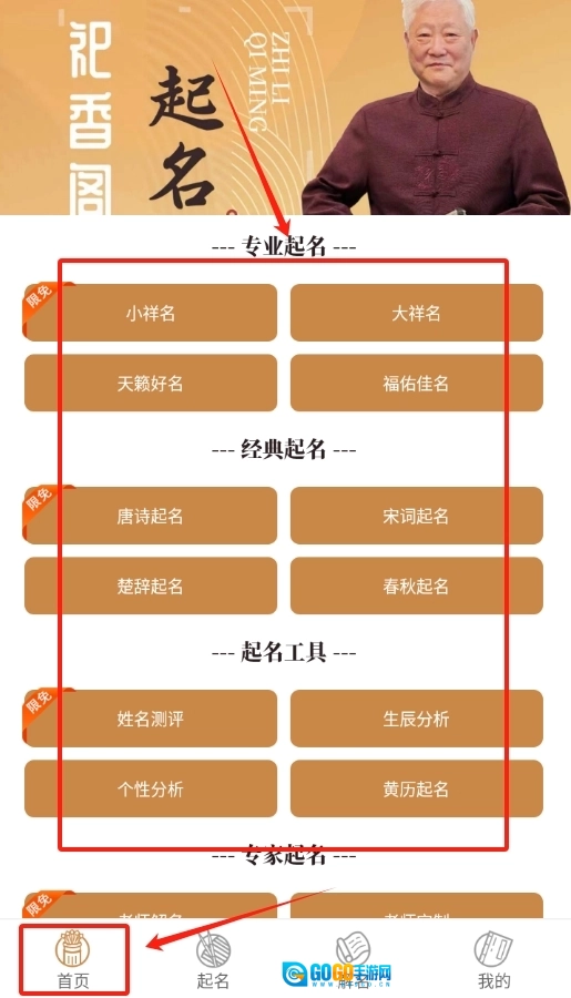 打开祀香阁软件后,在首页的生辰、音形义等选项中选择一个作为起名的依据。