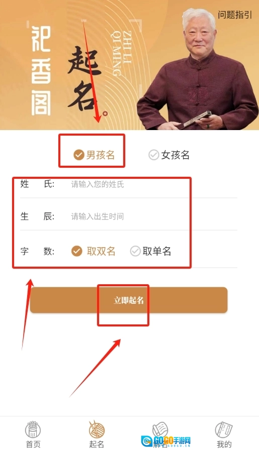 如果是给男孩取名,就选择“男生”选项,填写姓氏、出生日期和期望的名字字数,然后点击“立即起名”。