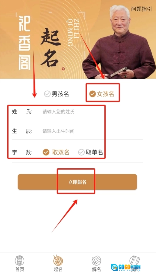 可根据自身需求,选择“新生儿起名”“公司取名”等不同模块,再输入姓氏、性别等相关信息。