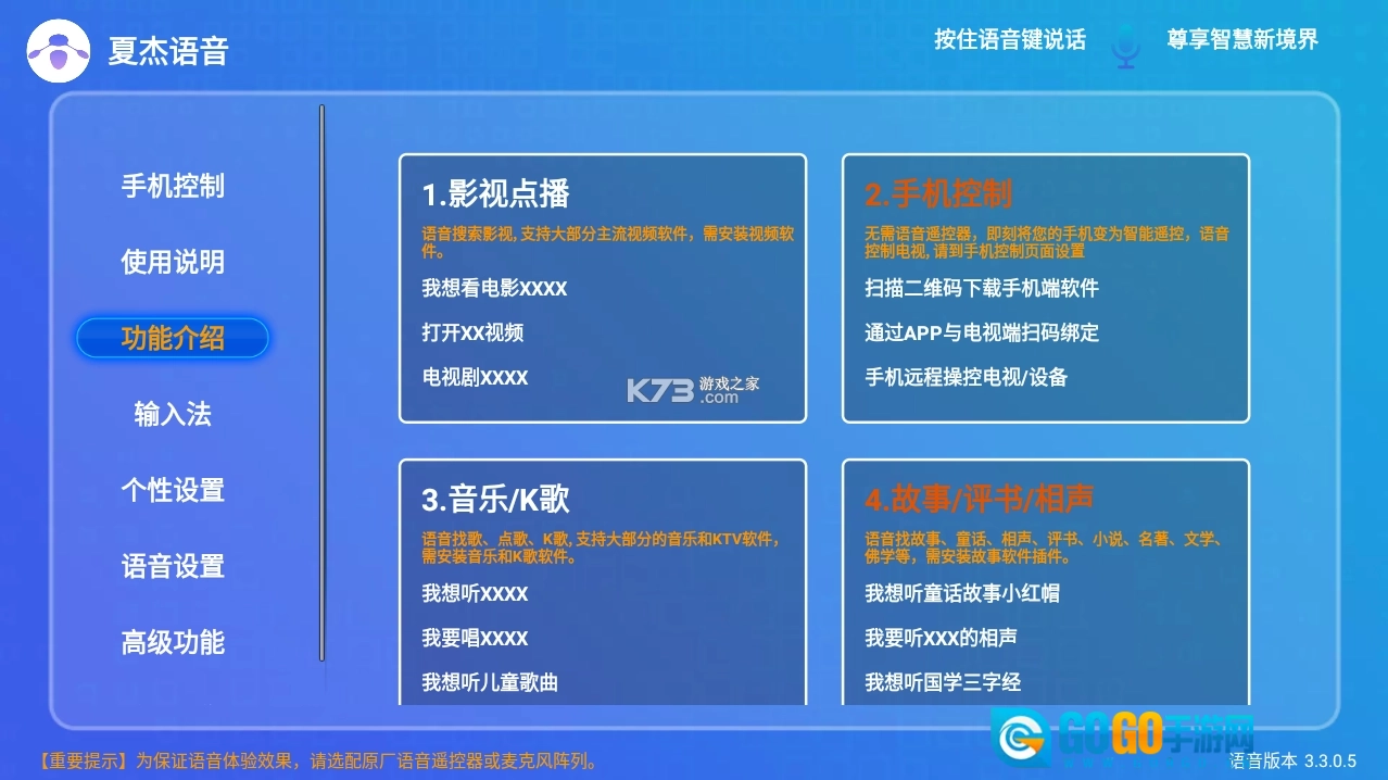 夏杰语音TV版是一款具备全方位智能语音服务能力的软件。它涵盖了语音输入与手机输入、语音换台、语音点歌及K歌、语音查找影视内容、语音播放故事、相声和评书、语音翻译、语音教育学习、语音操控智能家居、语音查询菜谱、语音智能问答互动、语音日常对话、古诗词与成语查询、语音点餐、票务及酒店预订、股票信息查询、交通票务与航班查询、天气查询、周边服务搜索与导航、在线购物、垃圾分类指引、软件与设备管理等三十余项实用功能。该软件可实现对海量影视资源、音乐曲库、菜谱内容及电视频道的搜索与操控,助力用户打造更智慧、便捷、高效的生活体验。
