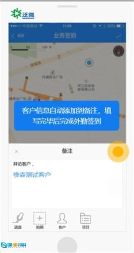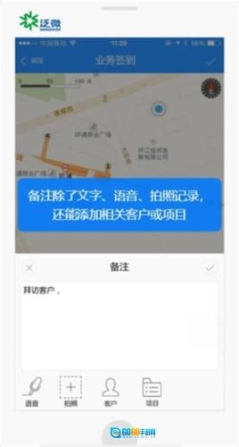 可以通过文字、语音、拍照等方式对外勤情况进行描述,之后点击客户选项。
