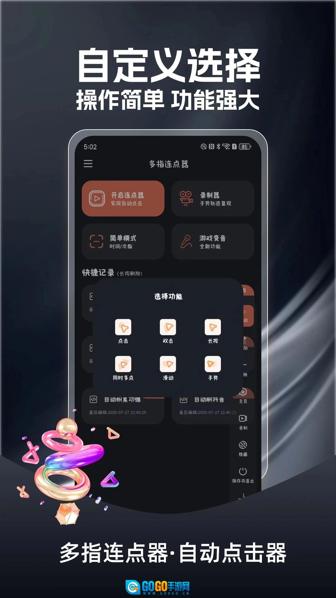 多指连点器是一款操作简单的免费连点工具,采用全新界面设计,让用户能轻松调整点击参数等各项功能选项,随时随地实现快速点击操作。它支持抢红包、点赞、抢票等多种连点场景,让用户自由享受便捷的自动点击服务。此外,软件功能丰富且无需特殊权限即可直接使用,能为用户带来自动化的点击体验,全面满足各类使用需求,还可轻松设置不同点击模板并应用。有需要的用户,欢迎到本站获取这款软件。