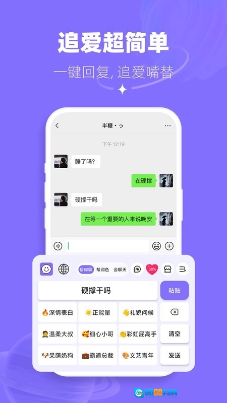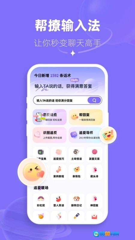 帮撩输入法是专为恋爱沟通场景打造的智能聊天助手,它不只是简单的输入工具,更是助力你恋爱进程的得力神器。不管你是社交经验较少的新手,还是不太擅长表达的男生,只要下载使用这款应用,就能在聊天时更加从容自信,有效拉近彼此的距离。依托先进的AI算法和海量的恋爱话术资源,帮撩输入法能够依据当下的聊天情境,即时推送合适的回应内容,轻松化解聊天中的冷场、尴尬以及紧张的社交状况,让你告别不知道如何开口的困扰。