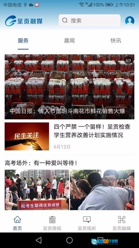 进入首页后,可点击服务、趣闻、快讯板块查看相关资讯内容。