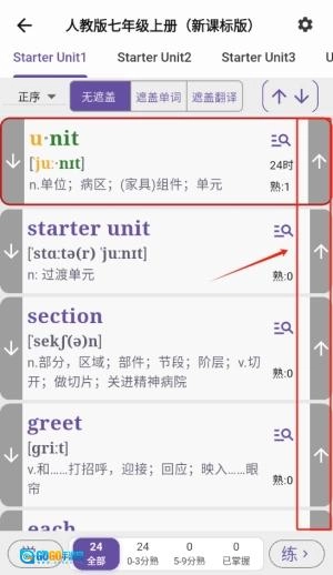 对于已经学过的单词,点击右侧的箭头可以提升熟练度,这有助于巩固记忆,增强学习能力。