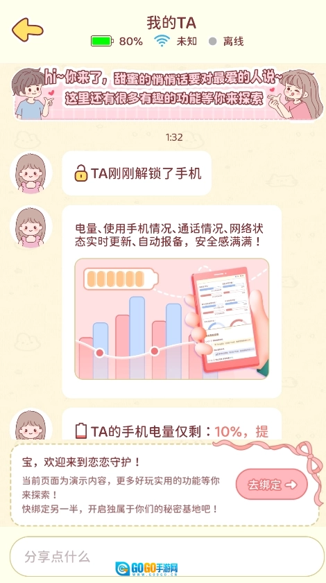 当你通过私密聊天发送实时消息时,系统会智能同步对方的手机状态(比如电量、位置等信息),并自动生成贴心的提醒内容。