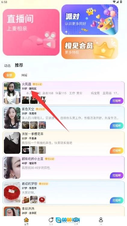 进入应用首页后,你可以浏览系统推荐的用户列表,要是遇到心仪的用户,点击对方头像就能进入查看详情啦。